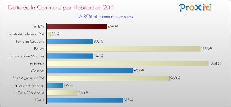 A La Roë, la dette due par habitant de la commune en 2011 est donc moins élevée de 1.78 % que pour des communes similaires.
