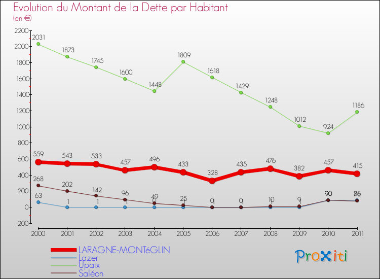 A Laragne-Montéglin, la dette par habitant a donc baissé de 25.76 % entre 2000 et 2011.