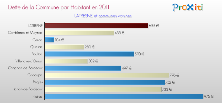 A noter : la valeur moyenne de la dette par habitant des communes françaises similaires à Latresne était de 706 € par habitant, en 2011.