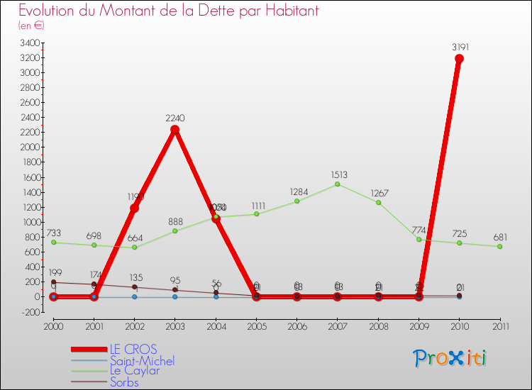A noter : la valeur moyenne de la dette par habitant des communes françaises similaires à Le Cros était de 503 € par habitant, en 2011.