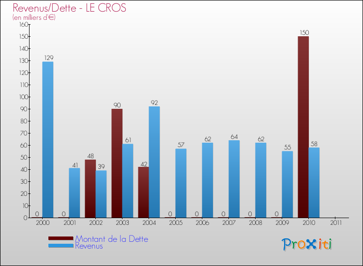 Comparaison Revenus/Dette de Le Cros (de 2000 à 2011)