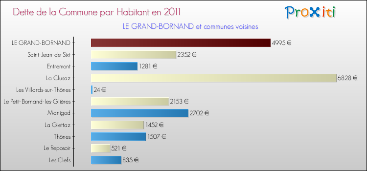 Par rapport aux 2 252 habitants de Le Grand-Bornand, en 2011 le poids de cette dette représente 4995 € par habitant.