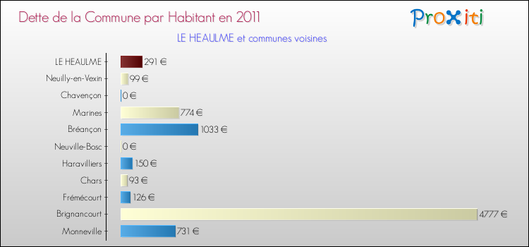 A noter : la valeur moyenne de la dette par habitant des communes françaises similaires à Le Heaulme était de 505 € par habitant, en 2011.