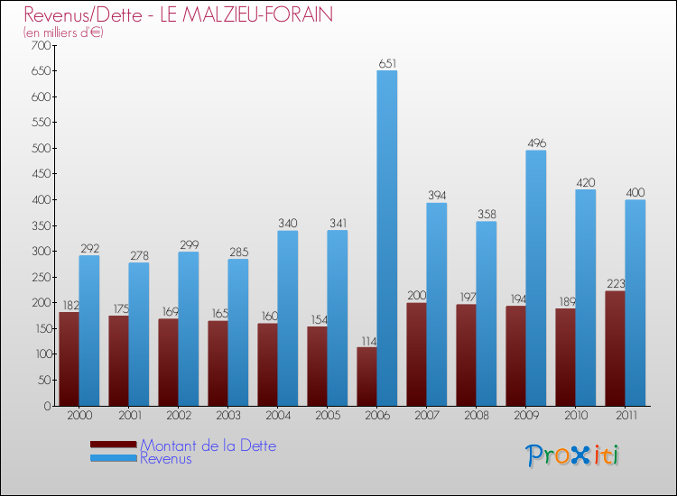 Comparaison Revenus/Dette de Le Malzieu-Forain (de 2000 à 2011)