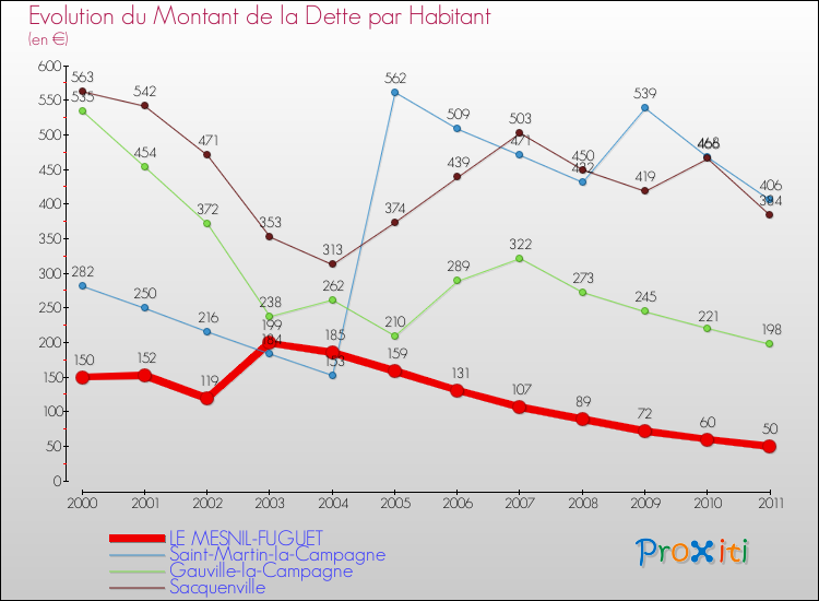 A Le Mesnil-Fuguet, la dette par habitant a donc baissé de 66.67 % entre 2000 et 2011.