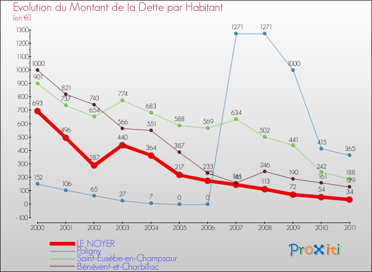 A Le Noyer, la dette par habitant a donc baissé de 95.09 % entre 2000 et 2011.