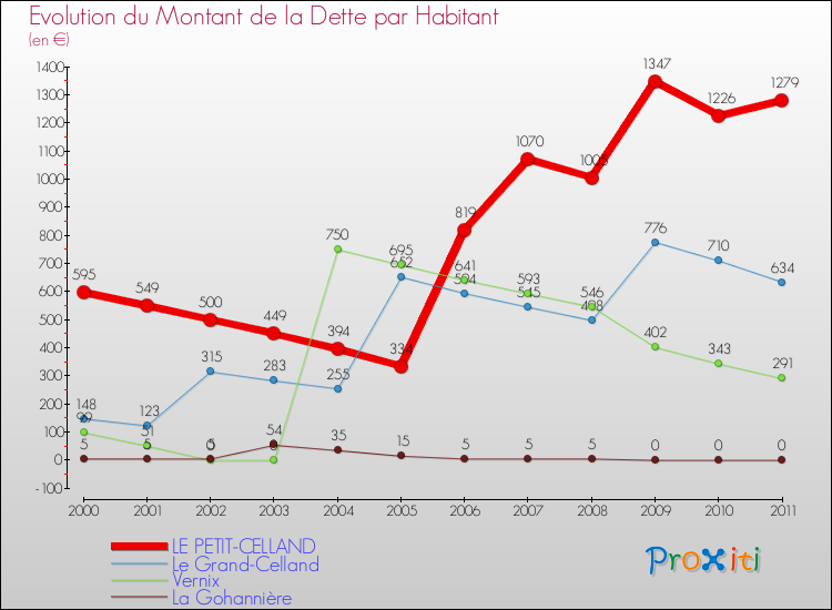 A Le Petit-Celland, ce montant de la dette est en augmentation de 6.73 % par rapport à 2010.