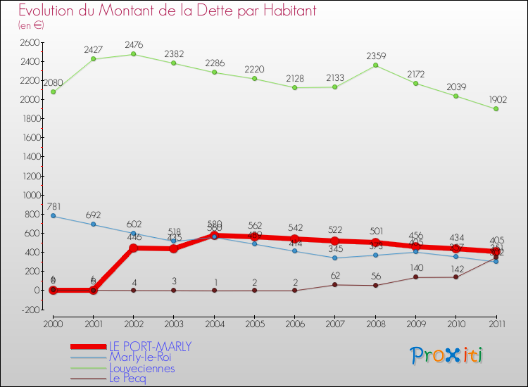 Par rapport aux 4 785 habitants de Le Port-Marly, en 2011 le poids de cette dette représente 405 € par habitant.