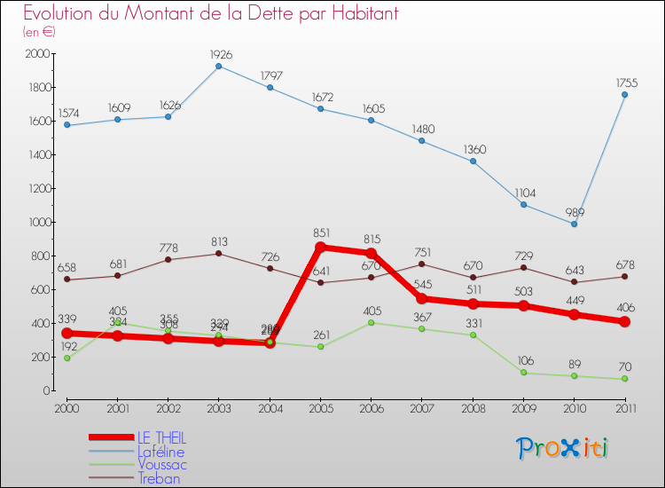 Par rapport aux 423 habitants de Le Theil, en 2011 le poids de cette dette représente 406 € par habitant.