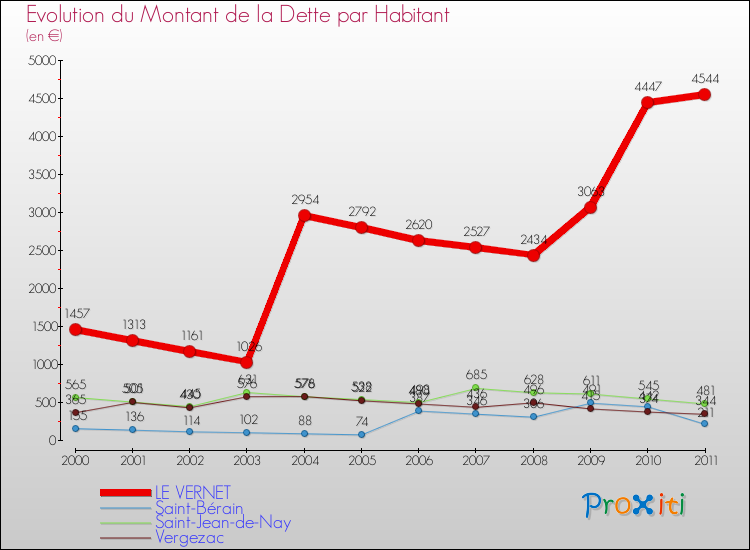 A Le Vernet, la dette par habitant a donc augmenté de 211.87 % entre 2000 et 2011.