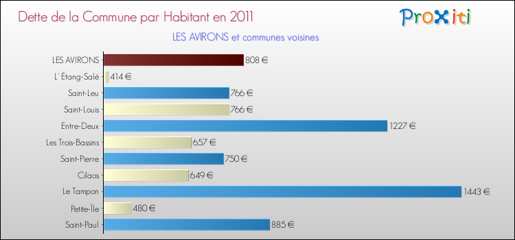 A Les Avirons, la dette due par habitant de la commune en 2011 est donc moins élevée de 13.58 % que pour des communes similaires.