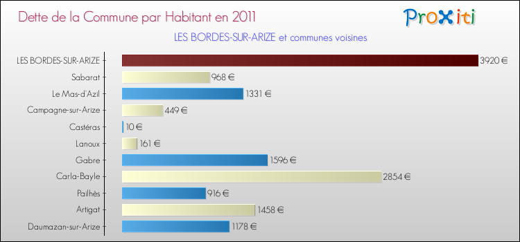 A Les Bordes-sur-Arize, la dette due par habitant de la commune en 2011 est donc plus élevée de 508.7 % que pour des communes similaires.