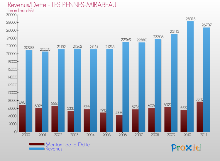 Comparaison Revenus/Dette de Les Pennes-Mirabeau (de 2000 à 2011)
