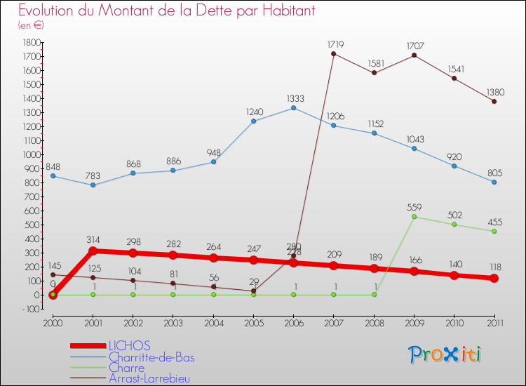 Par rapport aux 139 habitants de Lichos, en 2011 le poids de cette dette représente 118 € par habitant.