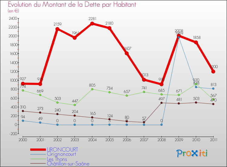 Pendant la même période, les communes françaises similaires à Lironcourt, ont vu leur dette par habitant augmenter de 24.08 % en moyenne entre 2000 et 2011.