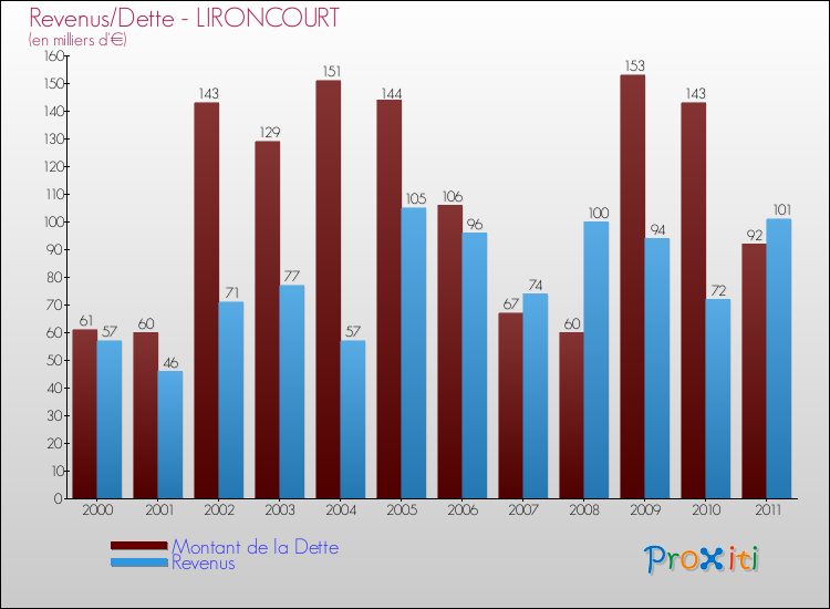 Comparaison Revenus/Dette de Lironcourt (de 2000 à 2011)