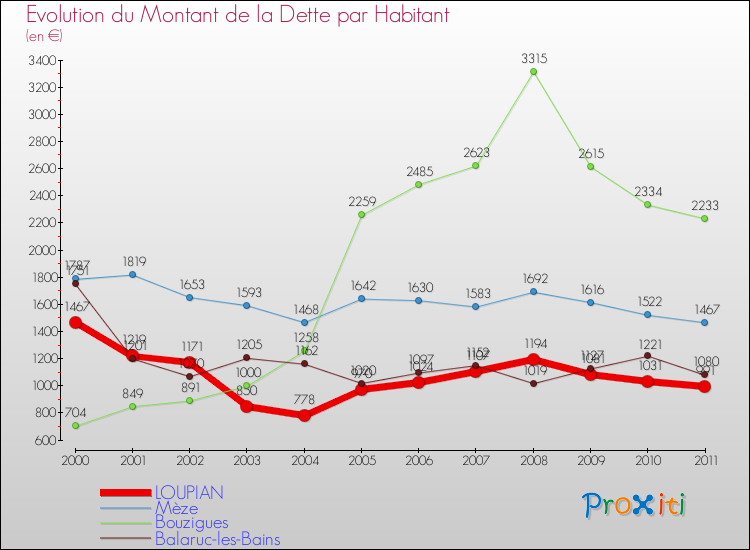 Par rapport aux 2 123 habitants de Loupian, en 2011 le poids de cette dette représente 991 € par habitant.