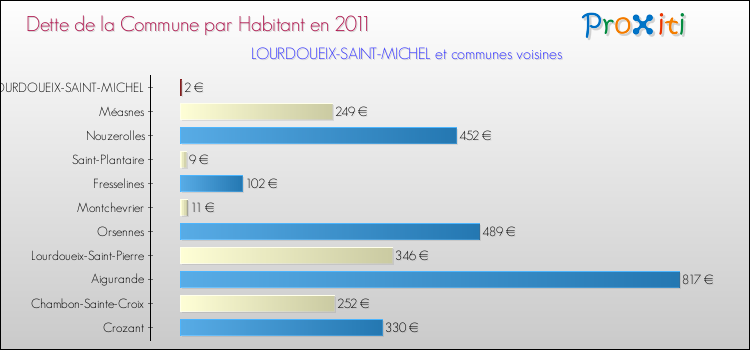 A Lourdoueix-Saint-Michel, la dette due par habitant de la commune en 2011 est donc moins élevée de 99.62 % que pour des communes similaires.