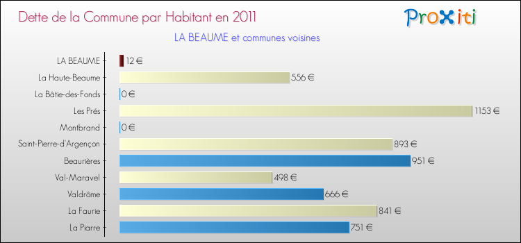A noter : la valeur moyenne de la dette par habitant des communes françaises similaires à La Beaume était de 503 € par habitant, en 2011.