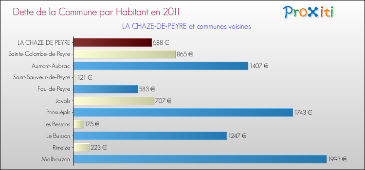Par rapport aux 250 habitants de La Chaze-de-Peyre, en 2011 le poids de cette dette représente 688 € par habitant.