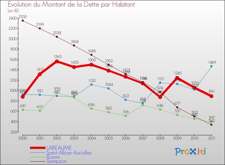 Par rapport aux 601 habitants de Labeaume, en 2011 le poids de cette dette représente 891 € par habitant.
