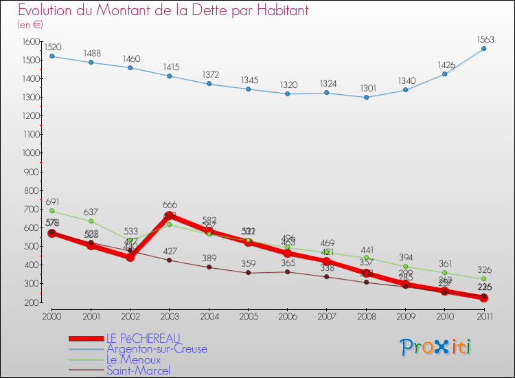 A Le Pêchereau, la dette par habitant a donc baissé de 60.66 % entre 2000 et 2011.