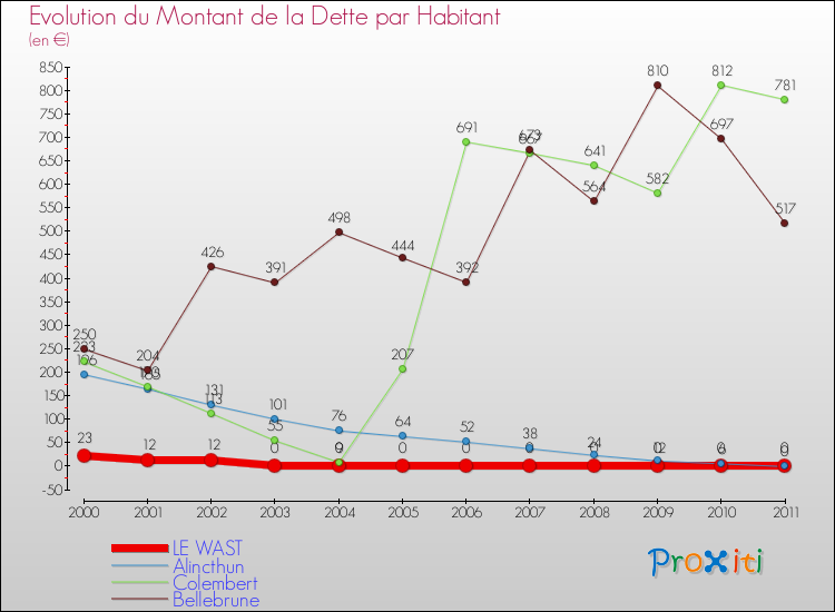 A Le Wast, la dette par habitant a donc baissé de 100 % entre 2000 et 2011.