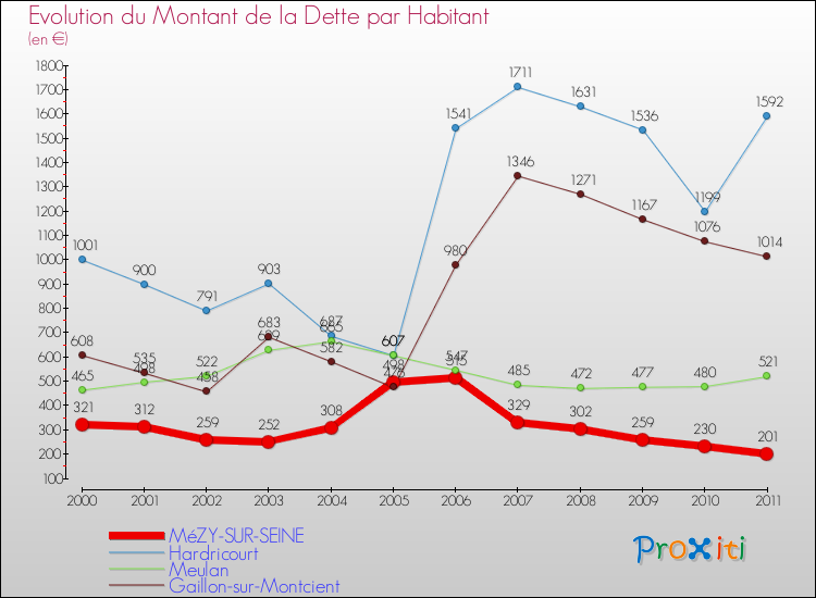 Pendant la même période, les communes françaises similaires à Mézy-sur-Seine, ont vu leur dette par habitant augmenter de 7.83 % en moyenne entre 2000 et 2011.