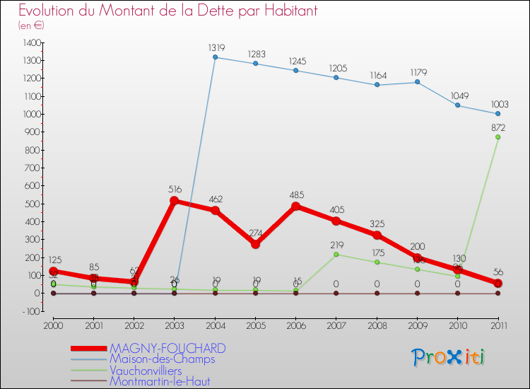Pendant la même période, les communes françaises similaires à Magny-Fouchard, ont vu leur dette par habitant augmenter de 4.67 % en moyenne entre 2000 et 2011.