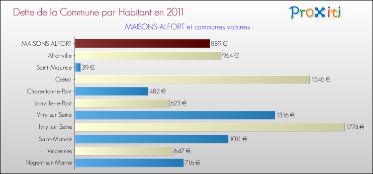 Par rapport aux 53 377 habitants de Maisons-Alfort, en 2011 le poids de cette dette représente 889 € par habitant.