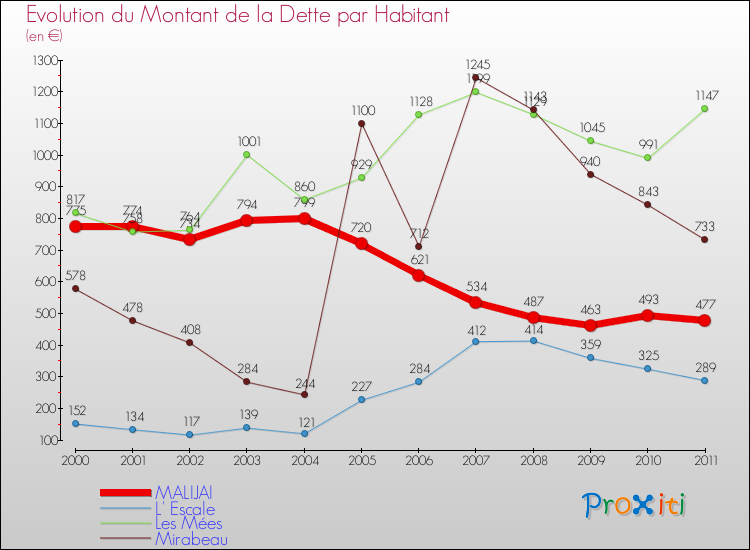 Par rapport aux 1 990 habitants de Malijai, en 2011 le poids de cette dette représente 477 € par habitant.