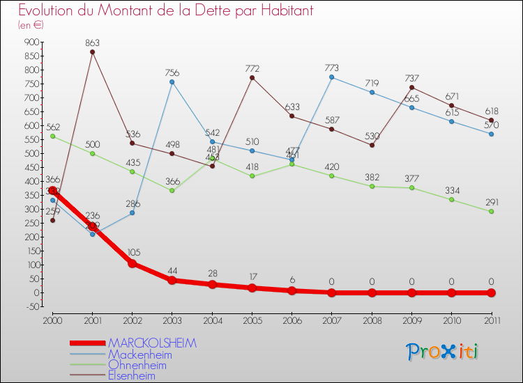 A Marckolsheim, la dette par habitant a donc baissé de 100 % entre 2000 et 2011.