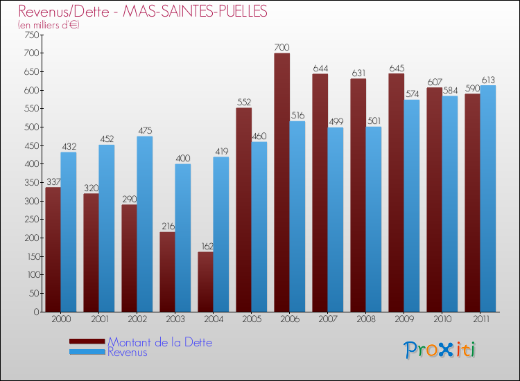 Comparaison Revenus/Dette de Mas-Saintes-Puelles (de 2000 à 2011)