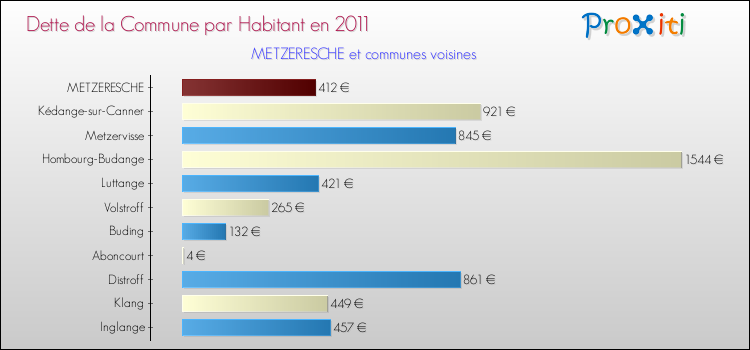 A Metzeresche, la dette due par habitant de la commune en 2011 est donc moins élevée de 30.41 % que pour des communes similaires.