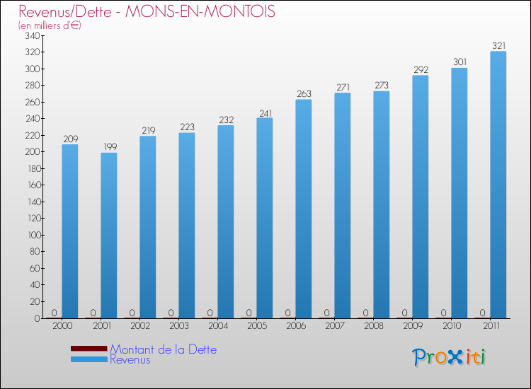 Comparaison Revenus/Dette de Mons-en-Montois (de 2000 à 2011)