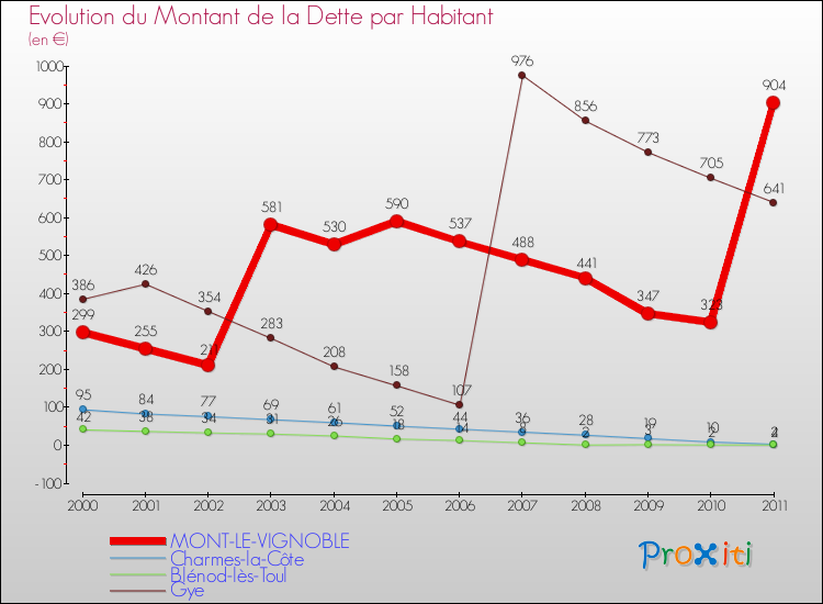 Pendant la même période, les communes françaises similaires à Mont-le-Vignoble, ont vu leur dette par habitant baisser de 11.65 % en moyenne entre 2000 et 2011.
