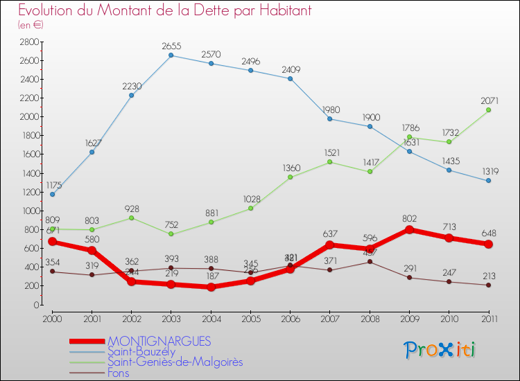 Pendant la même période, les communes françaises similaires à Montignargues, ont vu leur dette par habitant augmenter de 34.85 % en moyenne entre 2000 et 2011.