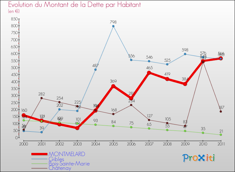 A Montmelard, la dette par habitant a donc augmenté de 253.75 % entre 2000 et 2011.