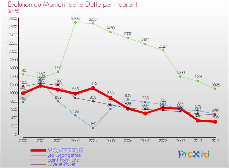 A Montperreux, la dette par habitant a donc baissé de 69.09 % entre 2000 et 2011.
