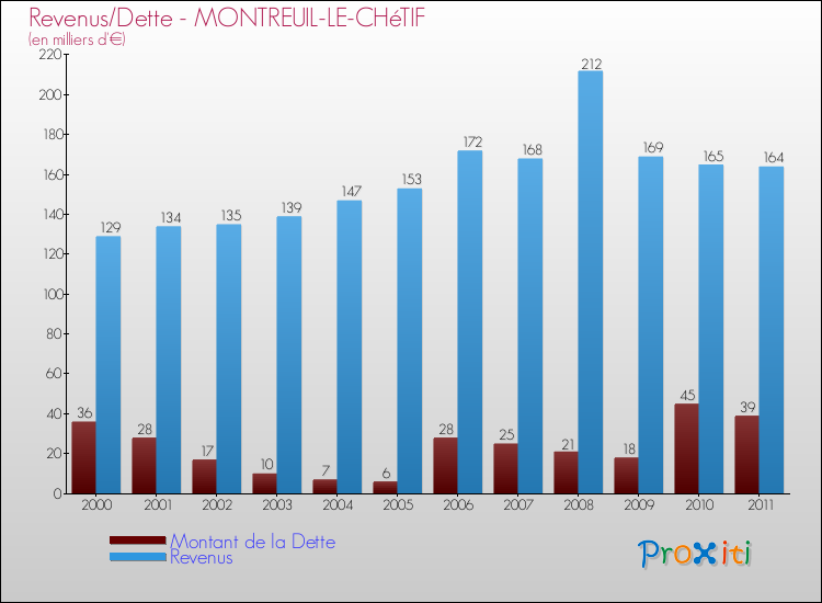 Comparaison Revenus/Dette de Montreuil-le-Chétif (de 2000 à 2011)