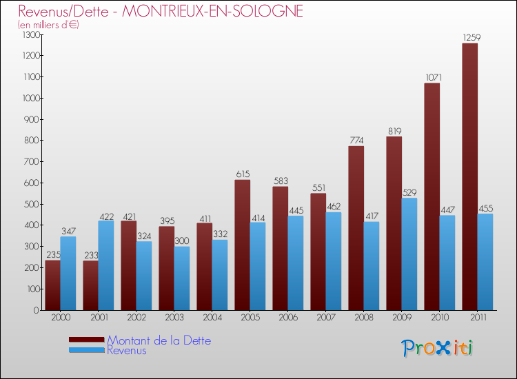 Comparaison Revenus/Dette de Montrieux-en-Sologne (de 2000 à 2011)