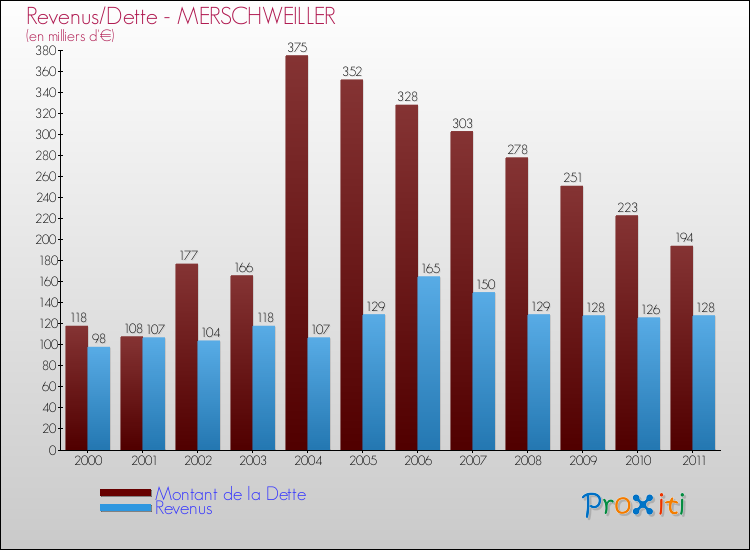 Comparaison Revenus/Dette de Merschweiller (de 2000 à 2011)