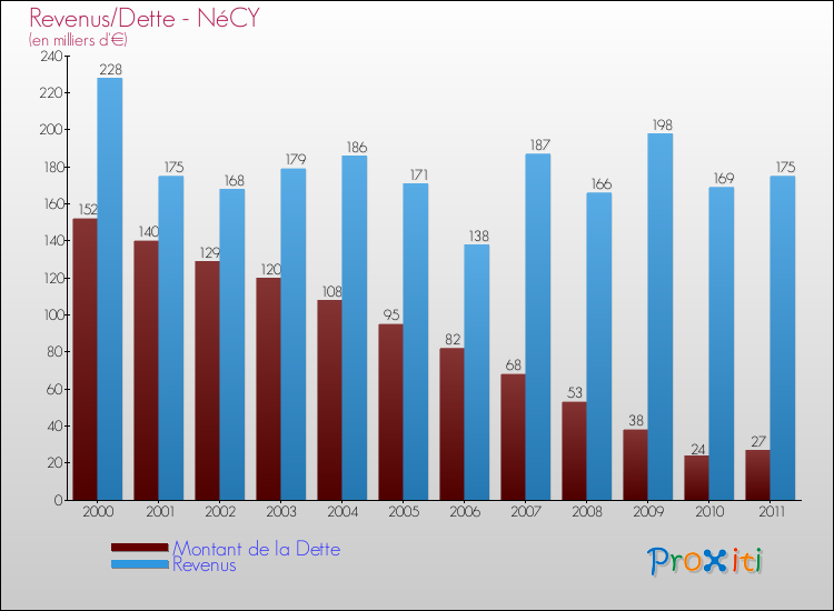 Comparaison de la dette et des revenus pour NéCY de 2000 à 2011