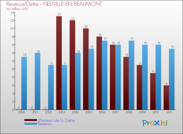 Comparaison Revenus/Dette de Neuville-en-Beaumont (de 2000 à 2011)