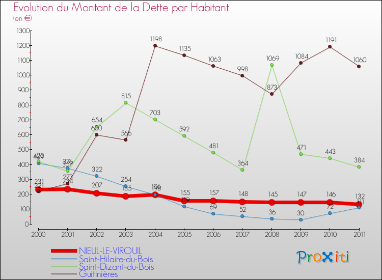 Pendant la même période, les communes françaises similaires à Nieul-le-Virouil, ont vu leur dette par habitant augmenter de 24.32 % en moyenne entre 2000 et 2011.