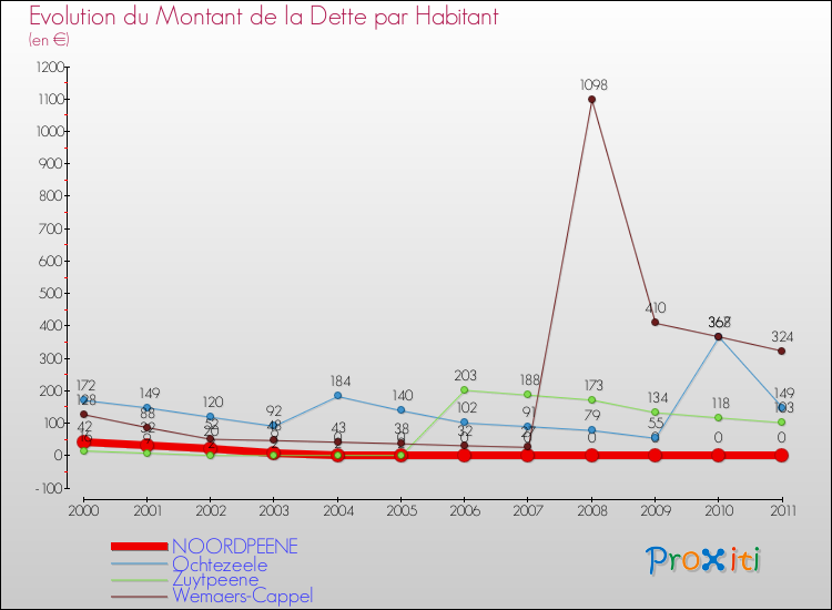 A Noordpeene, la dette par habitant a donc baissé de 100 % entre 2000 et 2011.