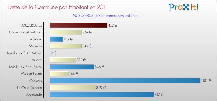A noter : la valeur moyenne de la dette par habitant des communes françaises similaires à Nouzerolles était de 503 € par habitant, en 2011.