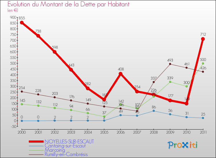 Pendant la même période, les communes françaises similaires à Noyelles-sur-Escaut, ont vu leur dette par habitant augmenter de 18.88 % en moyenne entre 2000 et 2011.