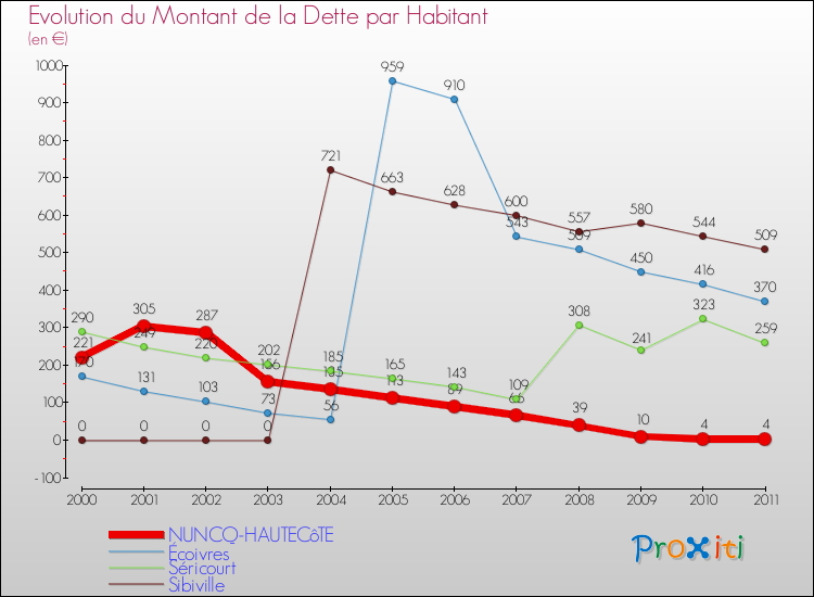 A Nuncq-Hautecôte, la dette par habitant a donc baissé de 98.19 % entre 2000 et 2011.