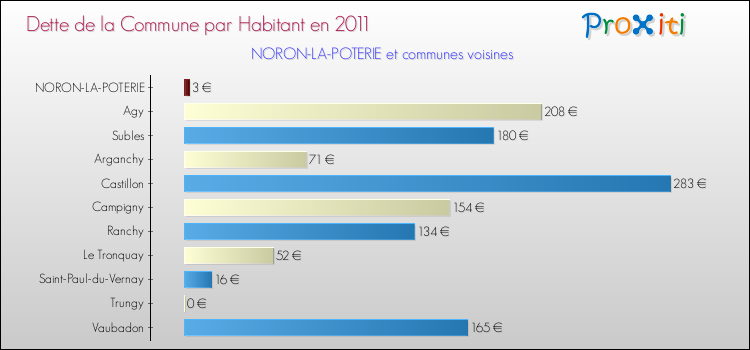A Noron-la-Poterie, la dette due par habitant de la commune en 2011 est donc moins élevée de 99.43 % que pour des communes similaires.